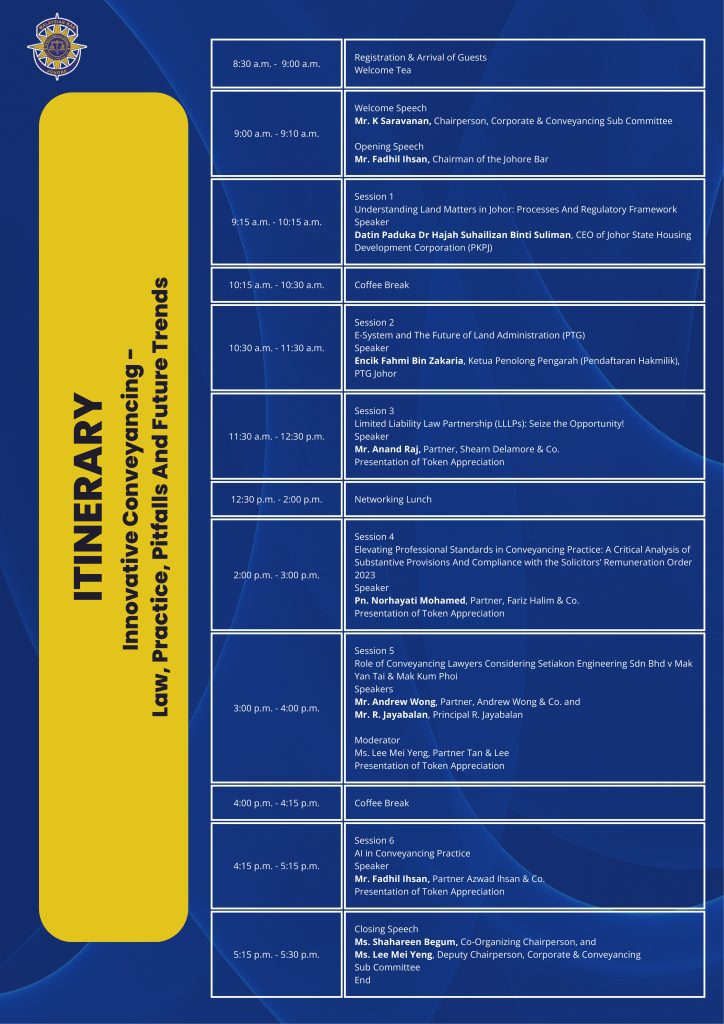 The Johore Bar Corporate & Conveyancing Sub Committee (“CCSC”) is organising a Conference on Innovative Conveyancing – Law, Practice, Pitfalls and Future Trends.