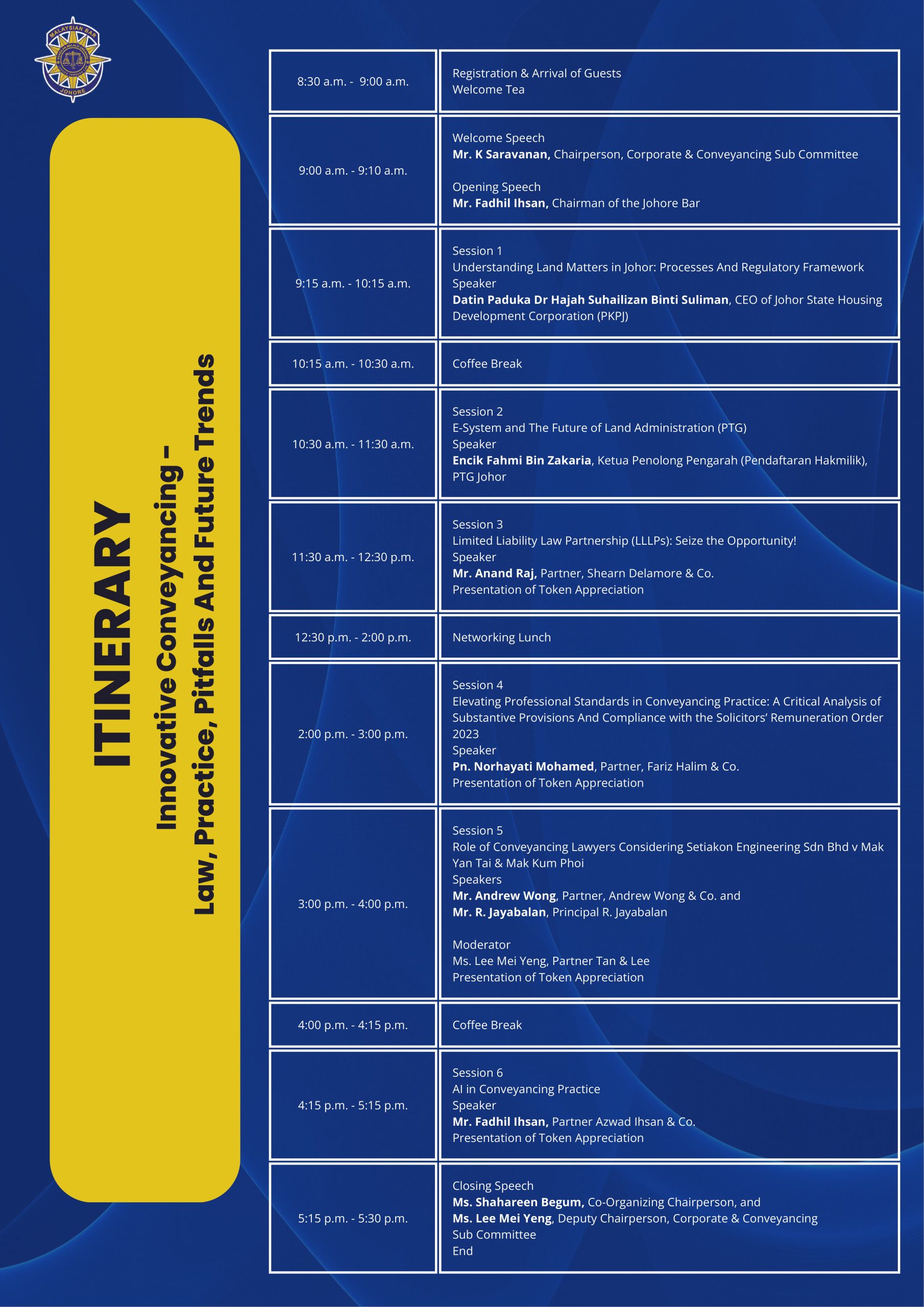 | 9:00 a.m. – 9:10 a.m. | Welcome Speech Mr. K Saravanan, Chairperson, Corporate & Conveyancing Sub Committee Opening Speech Mr. Fadhil Ihsan, Chairman of the Johore Bar |