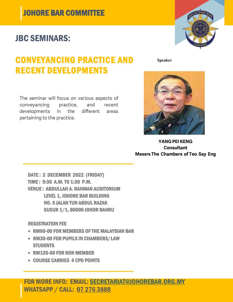 The seminar will be conducted by MR. YANG PEI KENG (MR. P K YANG, as he is popularly known), a senior member of the Johore Bar, currently a Consultant in Messrs The Chambers of Teo Say Eng, Johor Bahru.